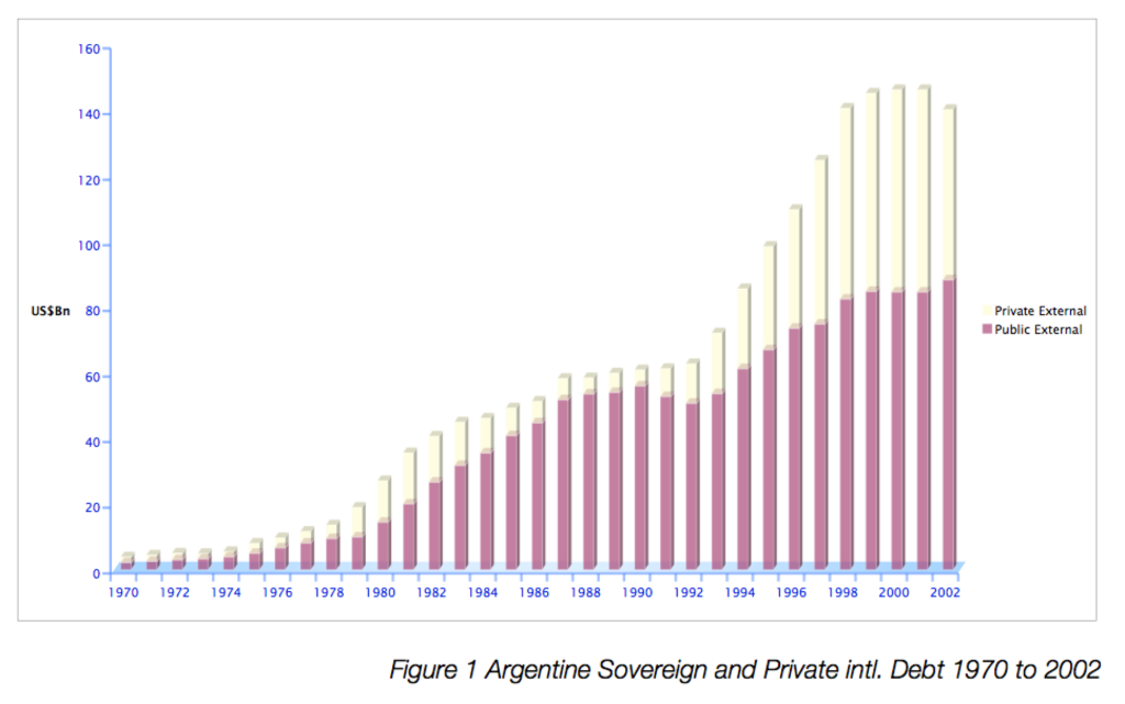 The Argentine tragedy is infamous in the annals of international debt. Argentine sovereign debt was extremely low the middle of the 70s but was increased 480% between 1976-1983 under the economic leadership of the Junta’s Finance Minister (17) Martinez de Hoz and his successors.