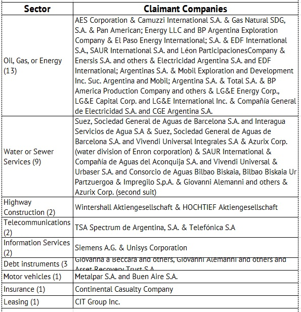 The following table breaks down the pending suits against the Argentine Government by sector, listing the names of the companies that are claimants. Many of the corporations litigating in the ICSID are the same firms allocated privatized public-service contracts by Menem’s government.